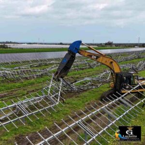 Estrazione dei pali con demolizione della struttura e successiva riduzione volumetrica mediante trituratore o cesoia, per poi inviare i vari rottami presso il nostro impianto di recupero.